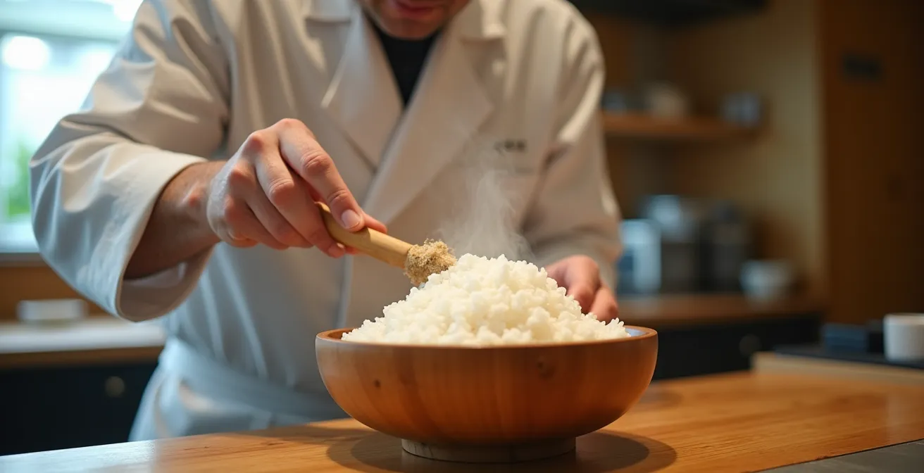 This guide deconstructs the process from a Gohan-Sommelier’s perspective. We will move beyond vague instructions to explore the scientific ‘why’ behind each critical step. We will analyze the molecular differences between vinegar types, calculate ratios with gram-level precision, and understand the physics of proper storage. By focusing on the chemistry, you will learn to control the outcome every single time, transforming your sushi rice from a source of anxiety into a pillar of culinary perfection.